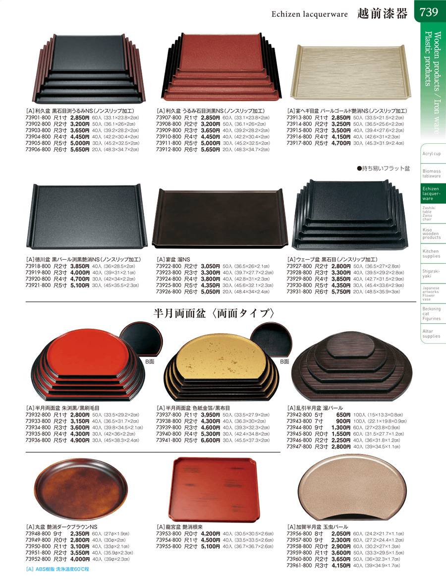 | 73922-800 | [A]宴盆 溜NS尺2寸 | 上代 3,050円(税抜) 卸値 1,678円(税抜) (45%OFF) | ||