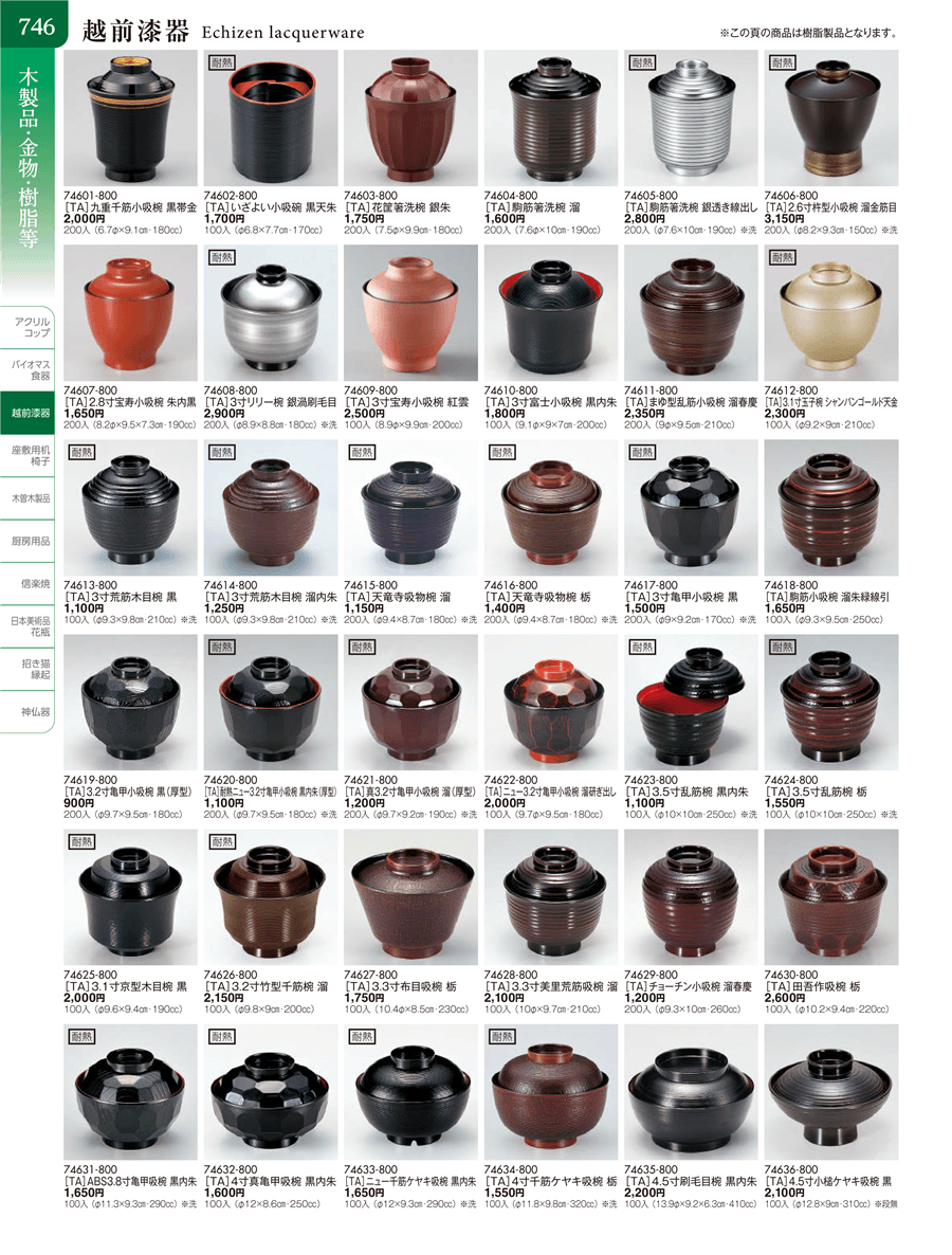 | 74615-800 | [TA]天竜寺吸物椀 溜 | 上代 1,150円(税抜) 卸値 633円(税抜) (45%OFF) | ||