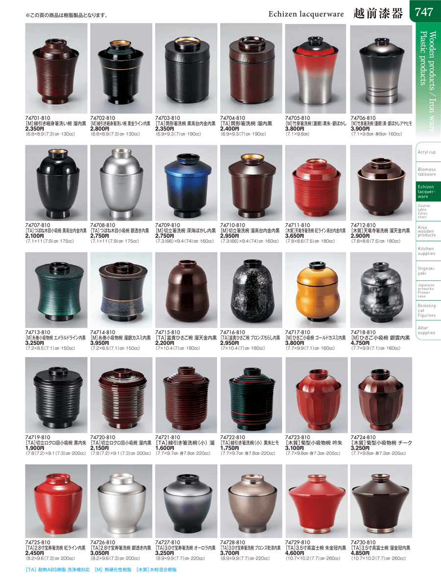 | 74710-810 | [M]切立箸洗椀 溜高台内金内黒 | 上代 2,950円(税抜) 卸値 1,623円(税抜) (45%OFF) | ||
