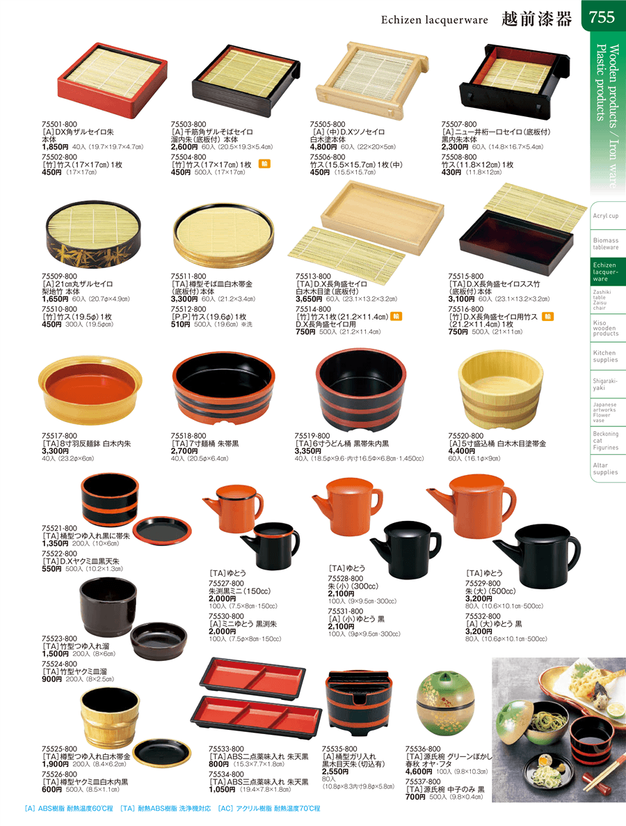 | 75534-800 | [TA]ABS三点薬味入れ 朱天黒 | 上代 1,050円(税抜) 卸値 578円(税抜) (45%OFF) | ||