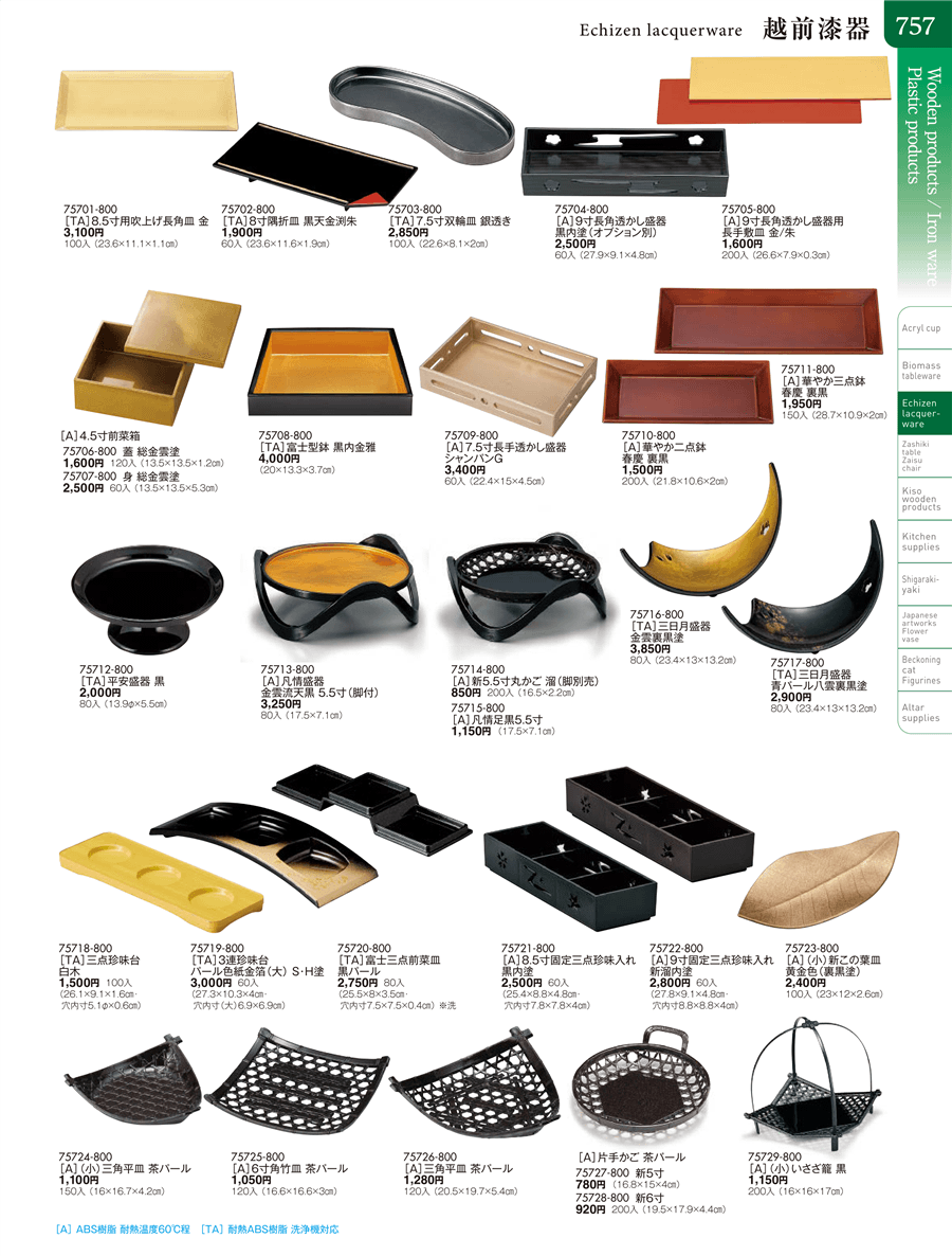 | 75710-800 | [A]華やか二点鉢 春慶 裏黒 | 上代 1,500円(税抜) 卸値 826円(税抜) (45%OFF) | ||