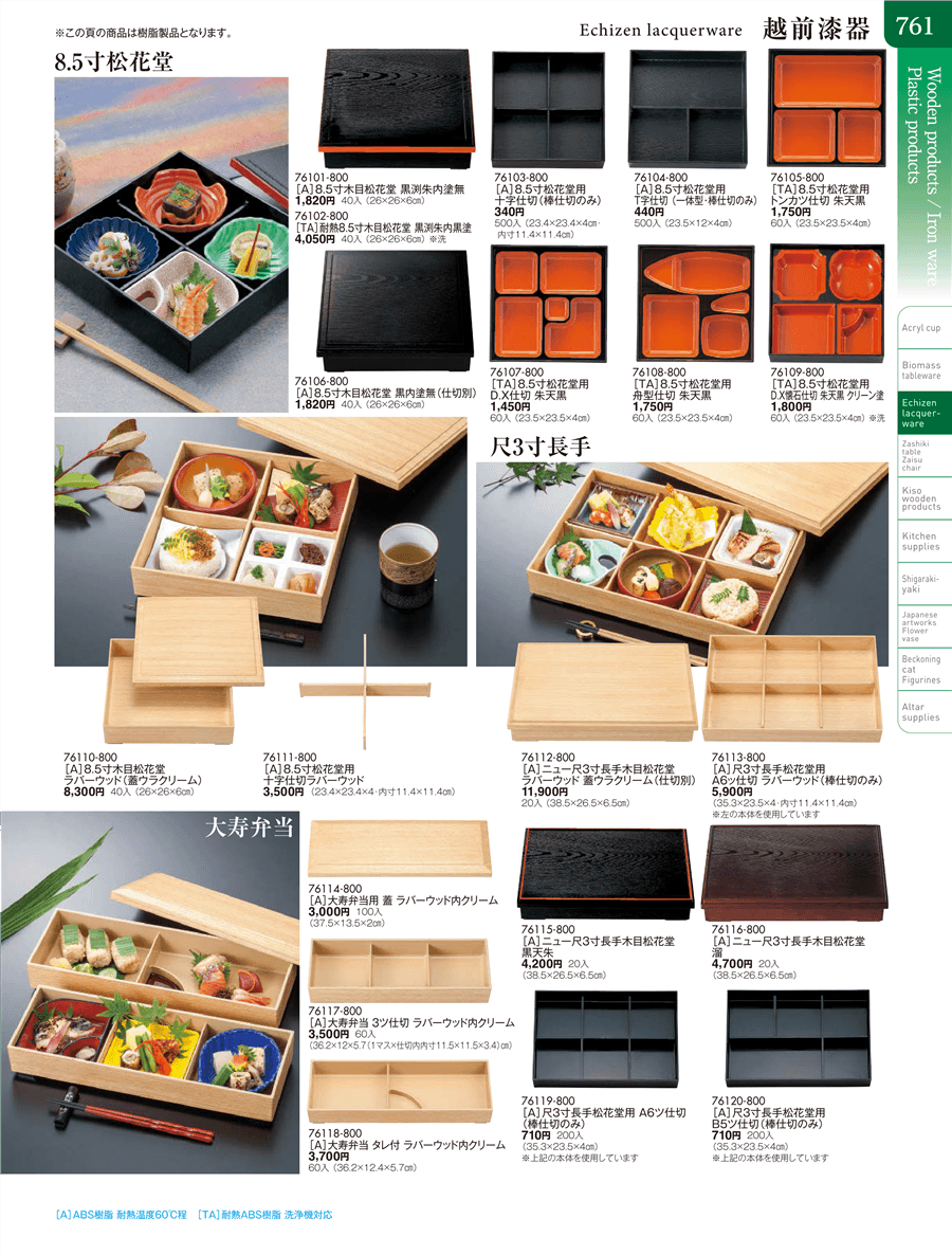 | 76112-800 | [A]ニュー尺3寸長手木目松花堂 ラバーウッド 蓋ウラクリーム(仕切別) | 上代 11,900円(税抜) 卸値 6,546円(税抜) (45%OFF) | ||