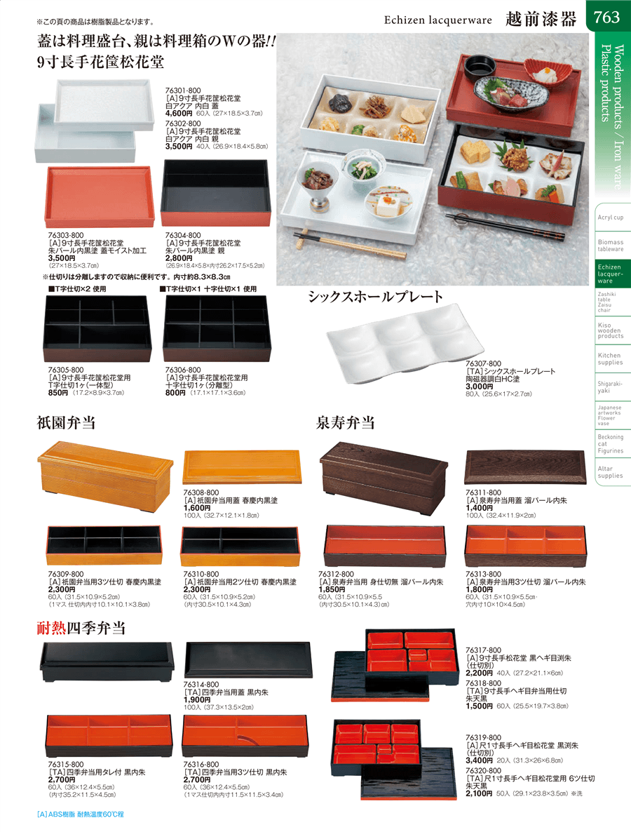 | 76309-800 | [A]祇園弁当用3ツ仕切 春慶内黒塗 | 上代 2,300円(税抜) 卸値 1,265円(税抜) (45%OFF) | ||