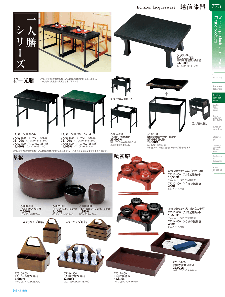 | 77302-800 | [A]新一光膳 黒石目[A]セット(強化塗) | 上代 36,100円(税抜) 卸値 19,855円(税抜) (45%OFF) | ||