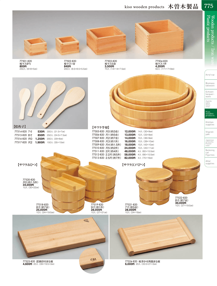 | 77510-820 | サワラ半切尺5(約2升) | 上代 24,000円(税抜) 卸値 13,201円(税抜) (45%OFF) | ||