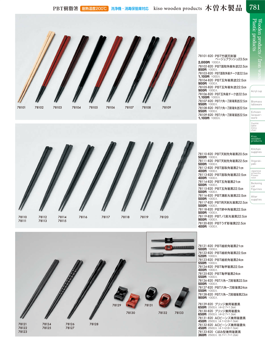 | 78123-820 | PBT越前角箸黒24㎝ | 上代 550円(税抜) 卸値 303円(税抜) (45%OFF) | ||