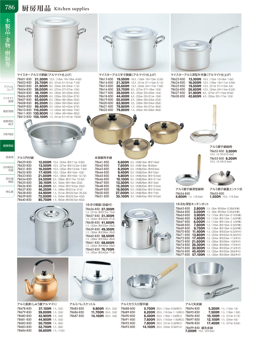 | 78640-850 | アルミ円付鍋 | 上代 85,700円(税抜) 卸値 47,136円(税抜) (45%OFF) | ||