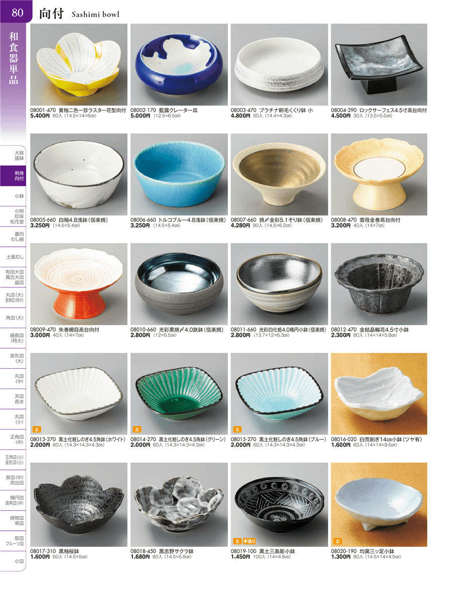 | 08016-020 | 白荒削ぎ14㎝小鉢(ツヤ有) | 上代 1,600円(税抜) 卸値 881円(税抜) (45%OFF) | ||