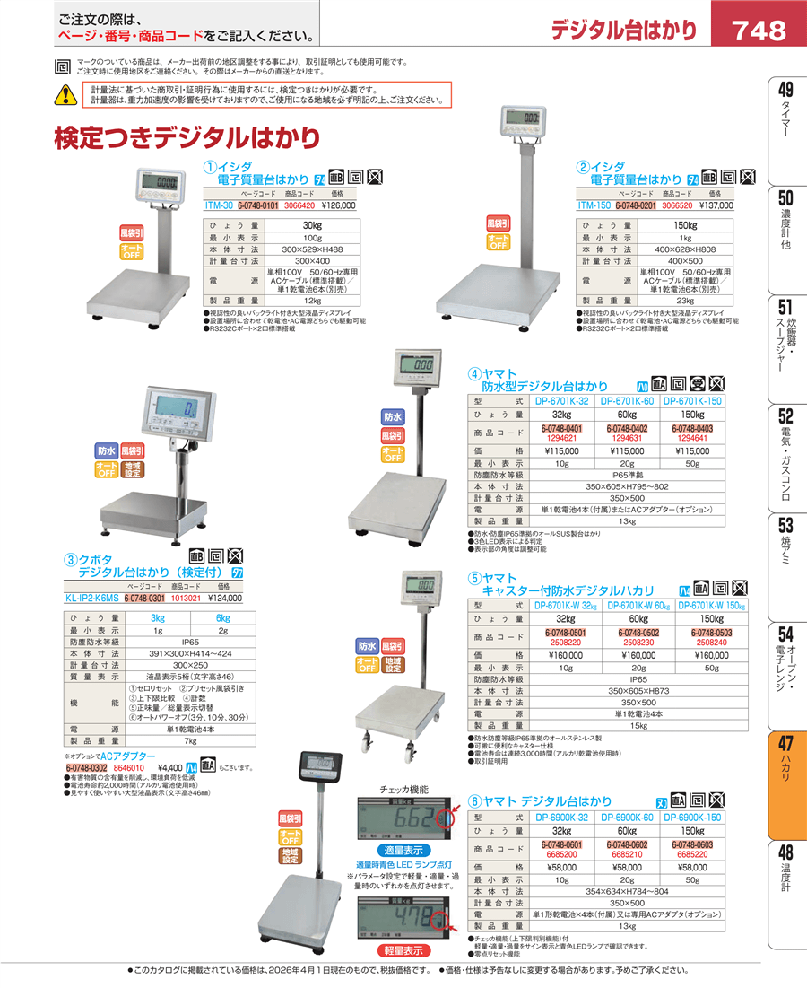 | e26-1294631 | ヤマト 防水型デジタル台はかり 60㎏ DP-6701K-60(県仕様) | 上代 115,000円(税抜) 見積 | ||