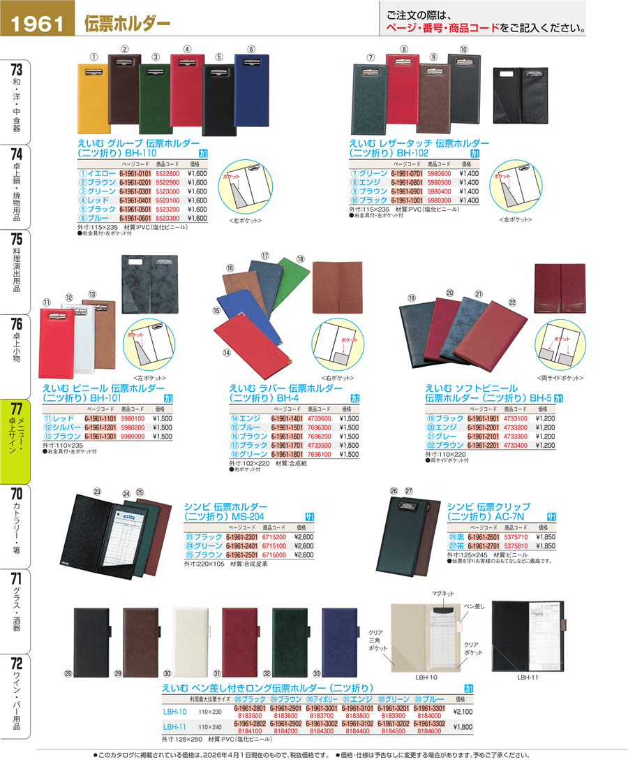 | e26-8183800 | えいむ ペン差し付きロング伝票ホルダー(ニツ折り)エンジ LBH-10 | 上代 2,100円(税抜) 見積