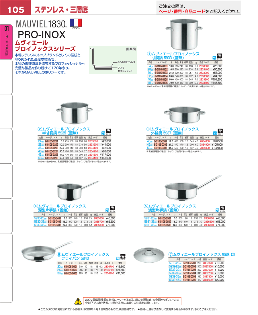 e26-2833500ムヴィエール プロイノックス 寸胴鍋(蓋無)5933-40㎝上代 101,500円(税抜)