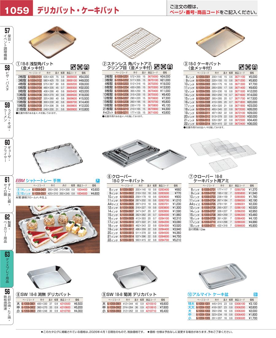 | e26-3669500-1059 | 18-8 浅型角バット(金メッキ付)10枚取 | 上代 18,000円(税抜) 見積 | ||