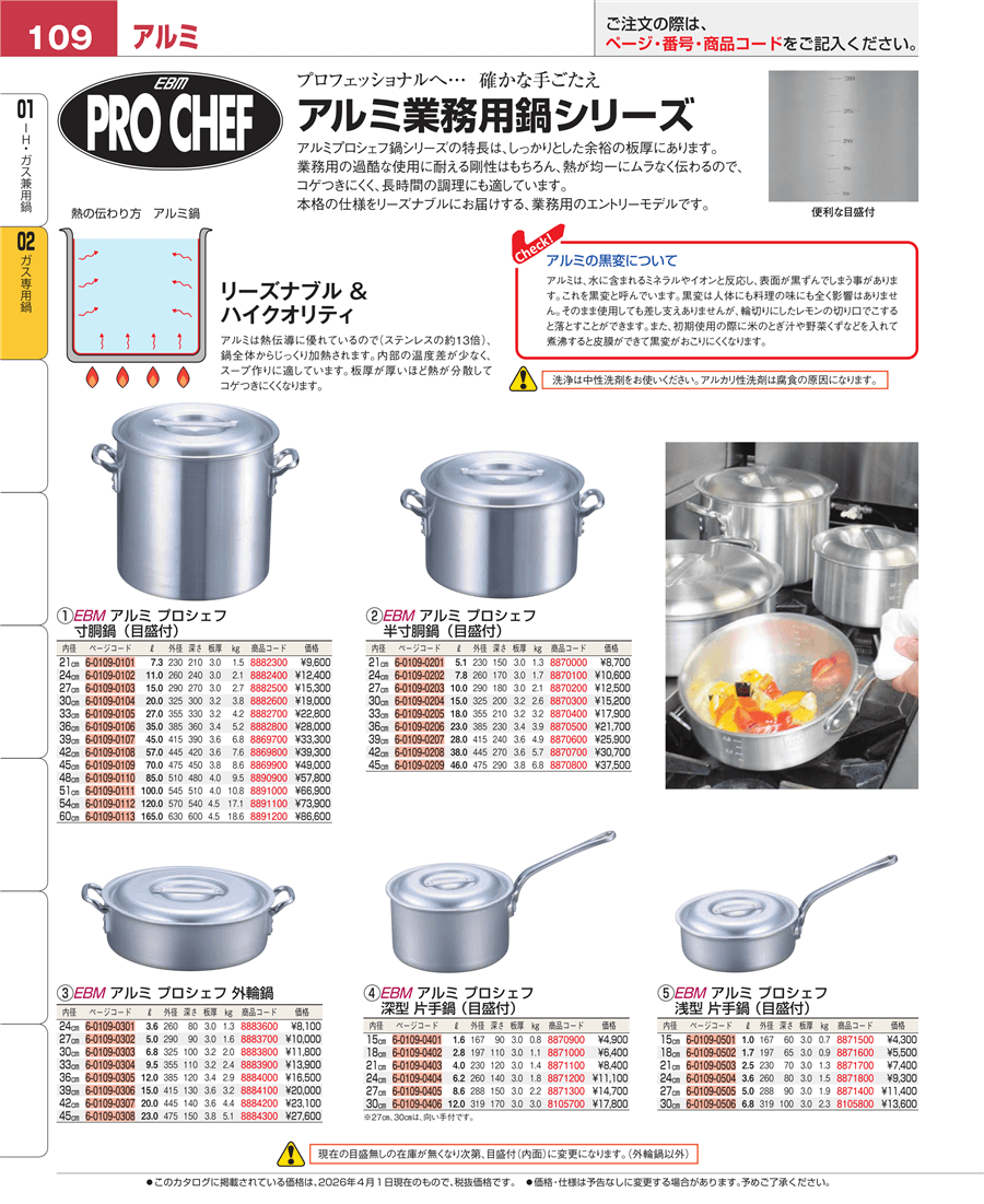 | e26-8890900 | EBM アルミ プロシェフ 寸胴鍋(目盛付)48㎝ | 上代 57,800円(税抜) 見積 | ||