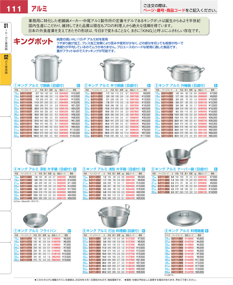 | e26-0087210 | キング アルミ 半寸胴鍋(目盛付)15㎝ 蓋無 | 上代 7,700円(税抜) 見積 | ||