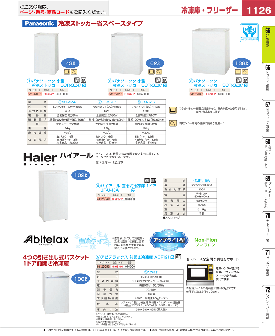 e26-6002632パナソニック 小型 冷凍ストッカー SCR-SZ67上代 167,000円(税抜)
