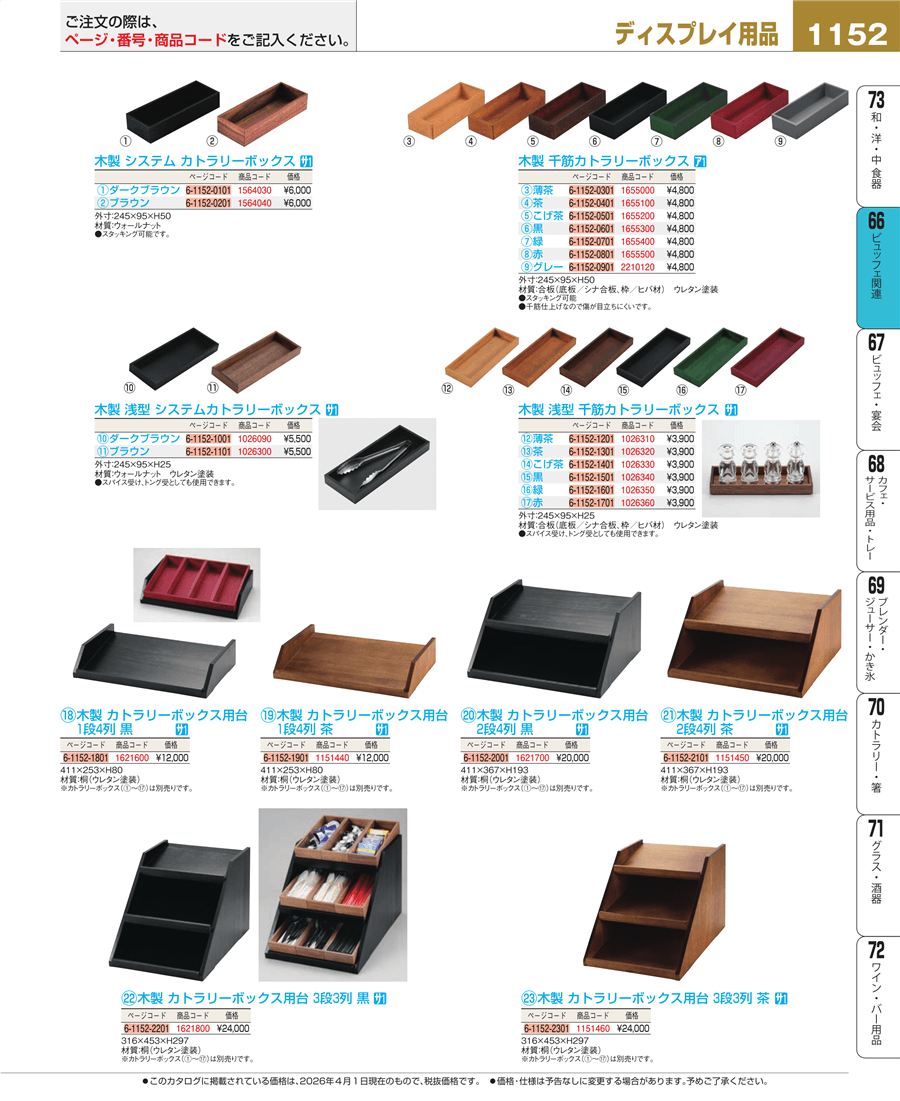 | e26-1151440 | 木製 カトラリーボックス用台 1段4列 茶 | 上代 12,000円(税抜) 見積 | ||