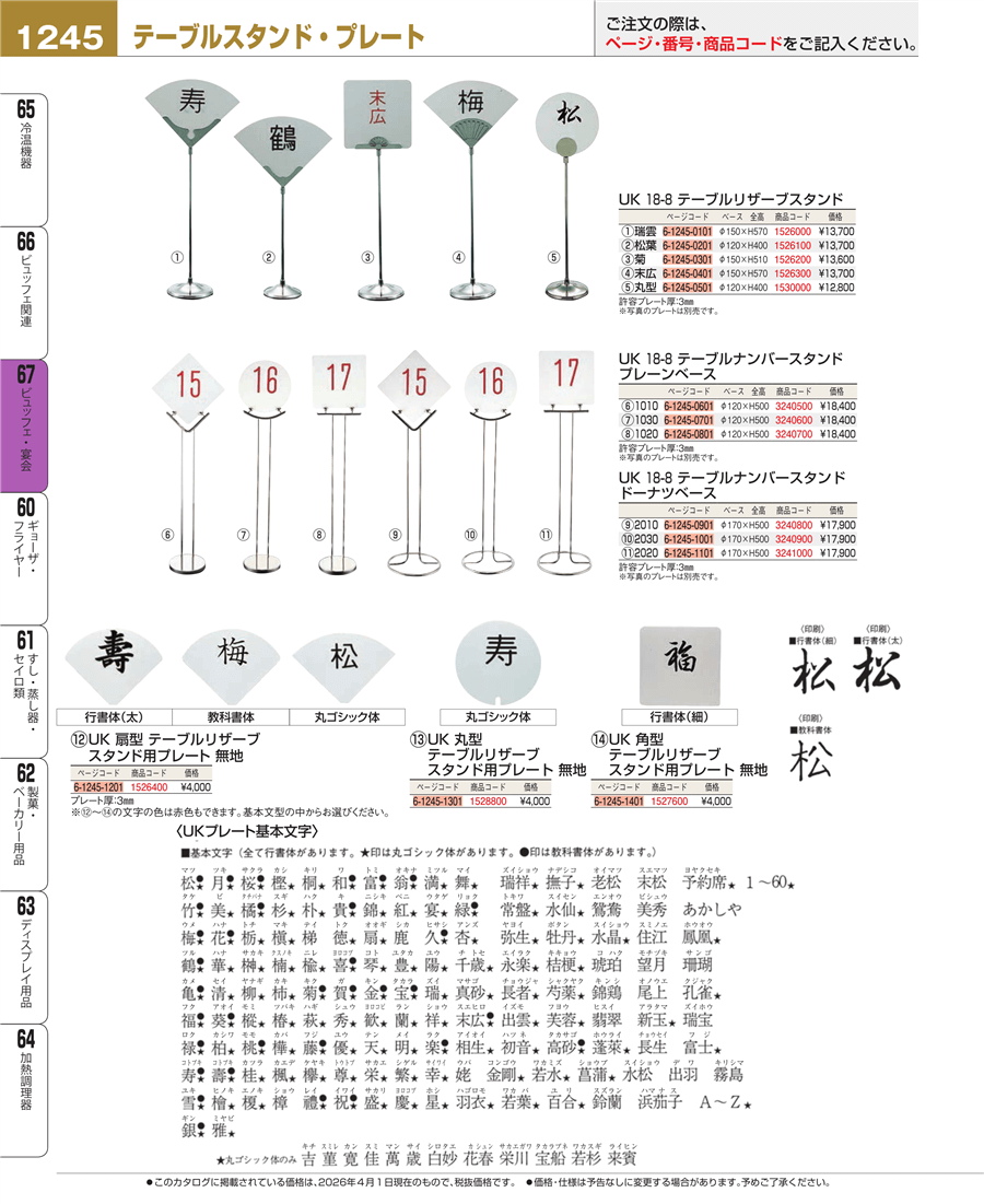 | e26-1526900 | UK 扇型 テーブルリザーブスタンド用プレート 行書教科書体2文字 | 上代 4,300円(税抜) 見積