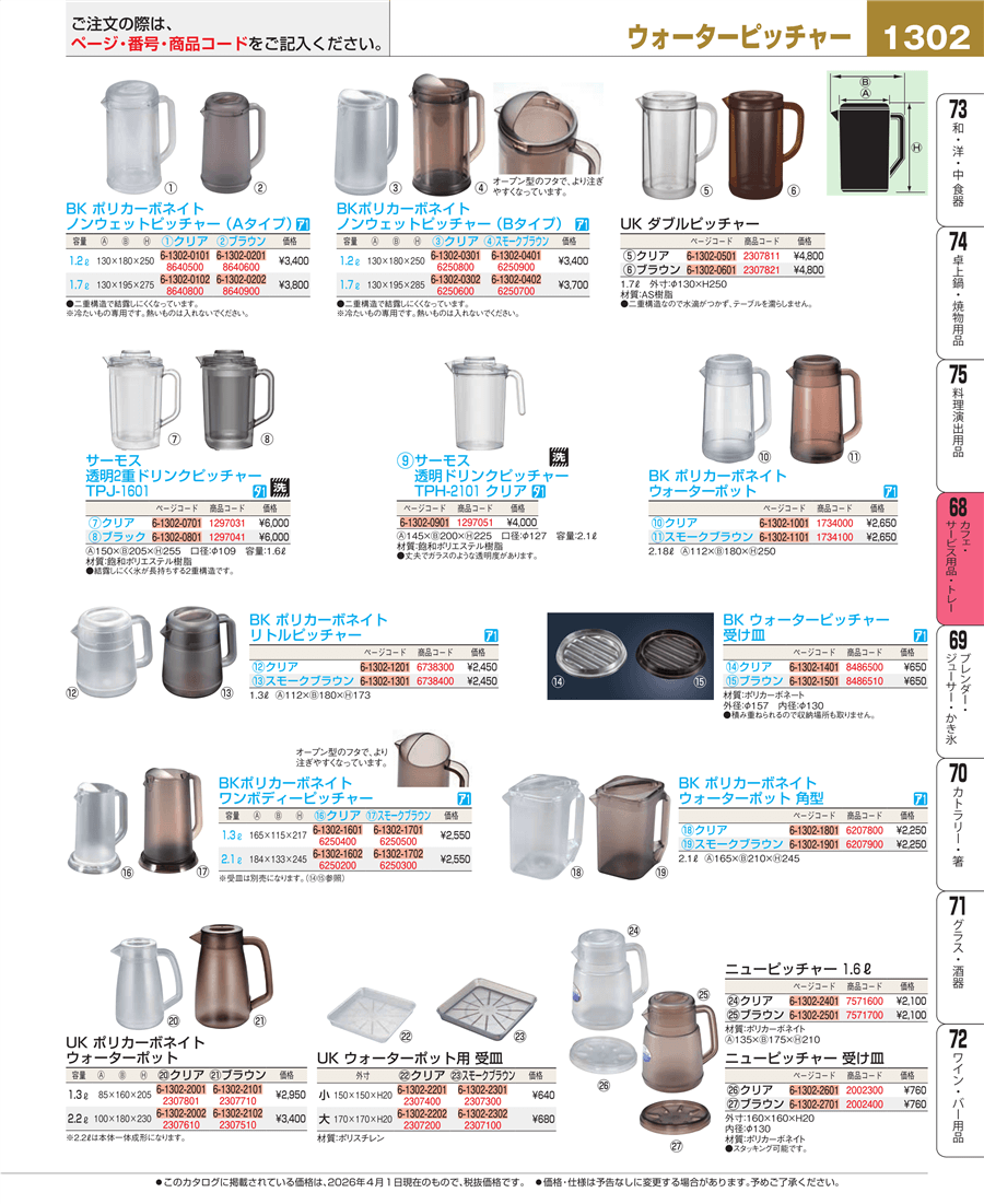 | e26-6250800 | BK ポリカーボネイト ノンウェットピッチャー(Bタイプ)1.2L クリア | 上代 3,400円(税抜) 見積