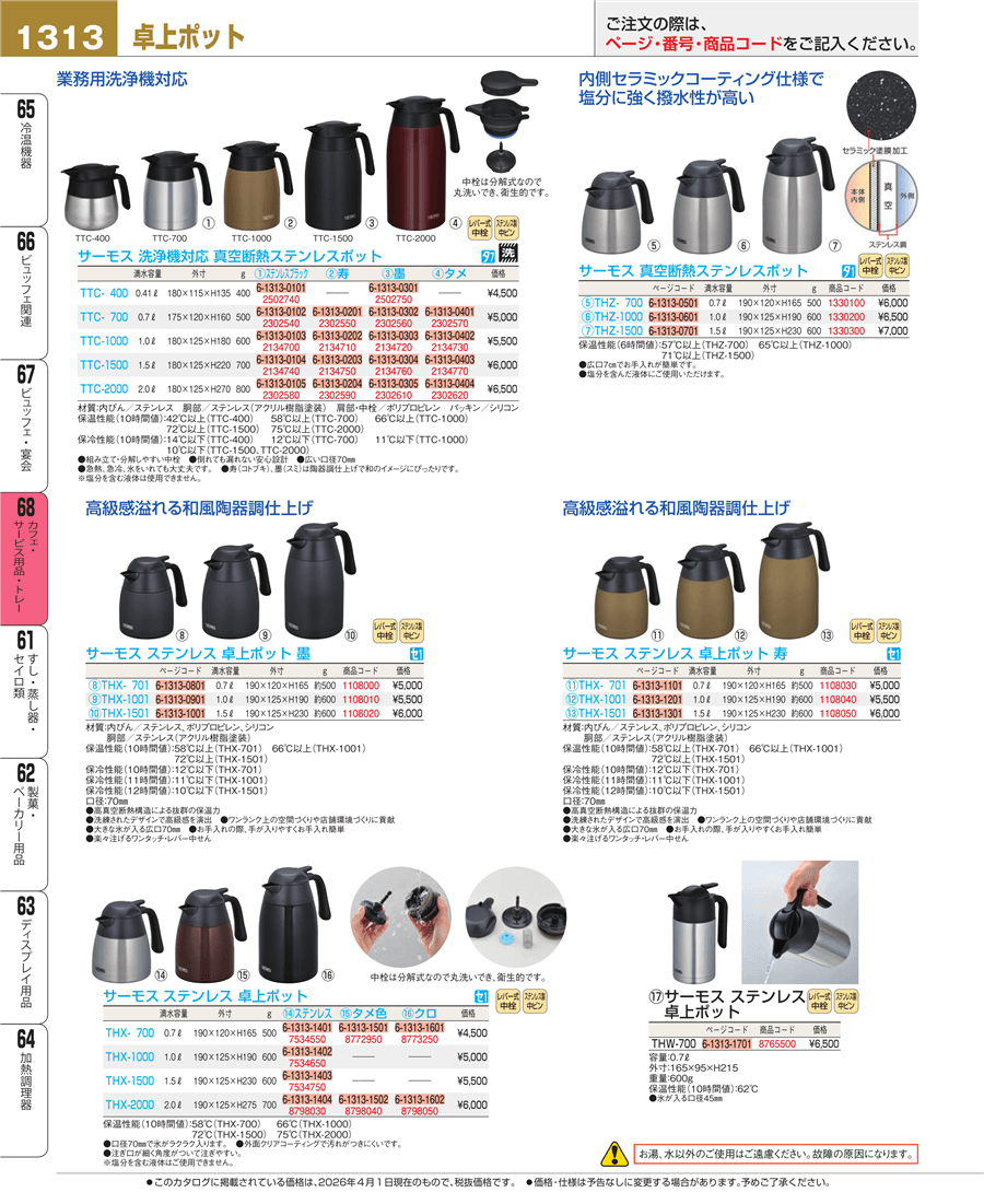 e26-2134720サーモス 洗浄機対応 真空断熱ステンレスポット TTC-1000 墨上代 5,500円(税抜)