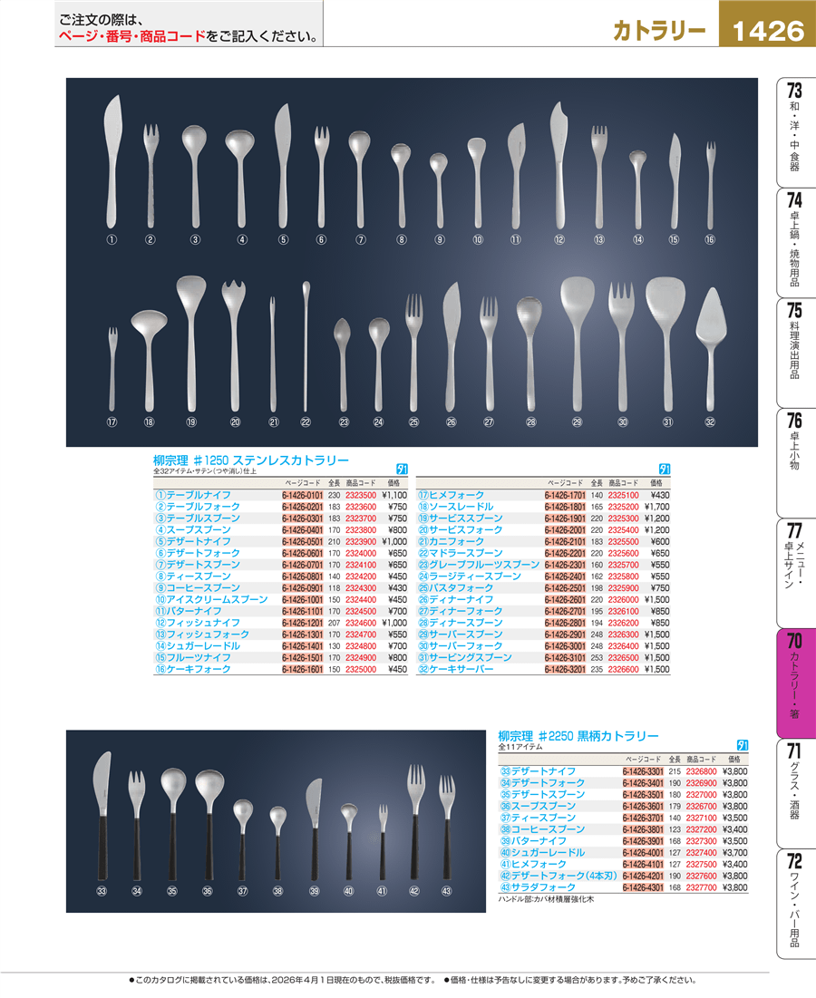 | e26-2326000 | 柳宗理 #1250 ステンレスカトラリー ディナーナイフ(12150601-0029) | 上代 1,500円(税抜) 見積