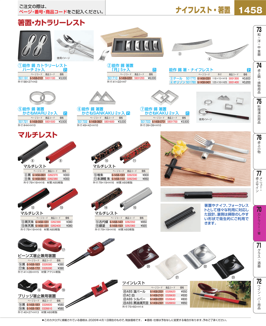 | e26-5931400 | 能作 錫 箸・ナイフレスト オリゾン 501780 | 上代 3,200円(税抜) 見積 | ||