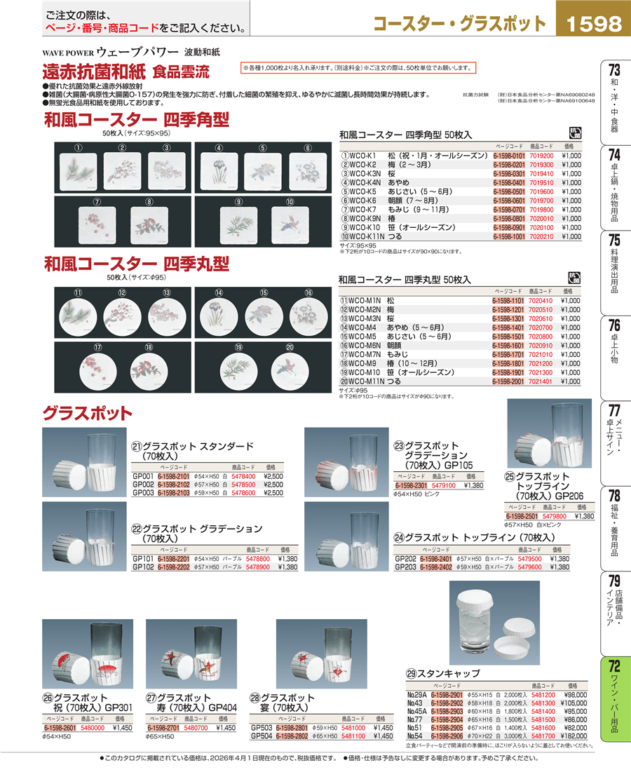 | e26-7020110 | 和風コースター 四季 角型(50枚入)WCO-K10N 笹 | 上代 1,000円(税抜) 見積
