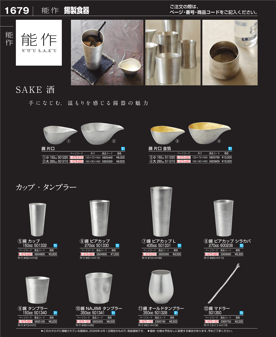 e26-5925100能作 錫 タンブラー 150㏄ 501340上代 6,200円(税抜)