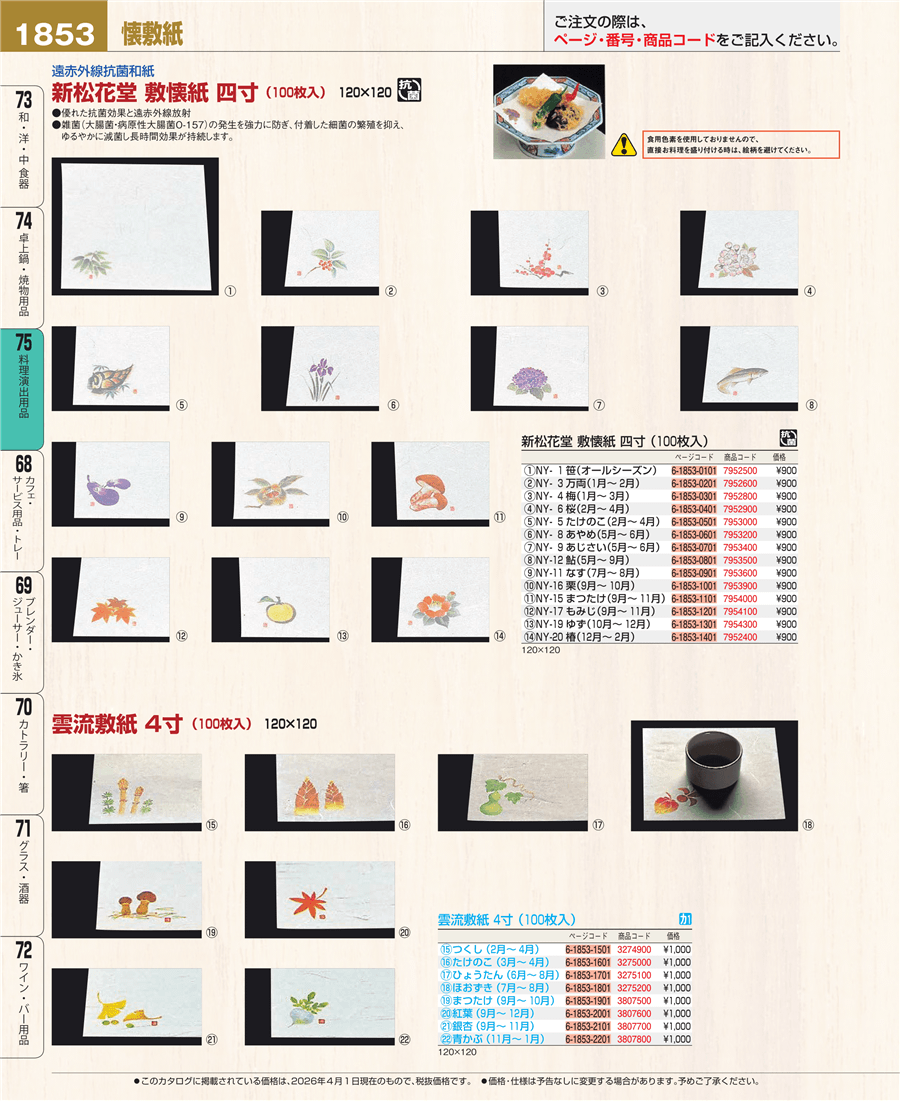 e26-7952900新松花堂 敷懐紙 四寸(100枚入)NY-6 桜(2月~4月)上代 900円(税抜)