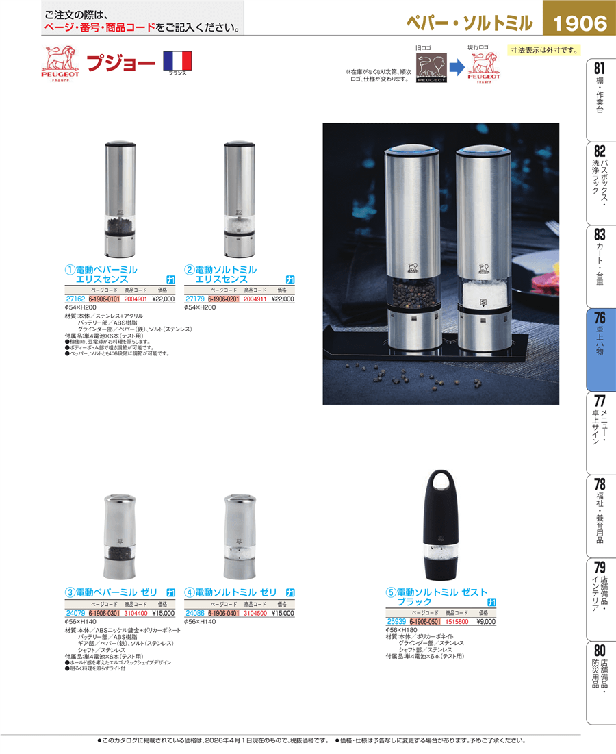 | e26-1515800 | プジョー 電動 ソルトミル ゼスト ブラック 25939 | 上代 9,000円(税抜) 見積 | ||