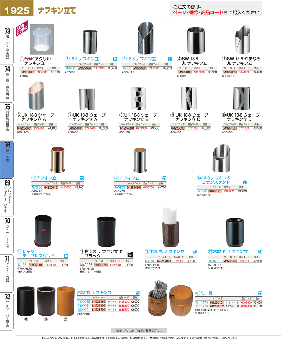 | e26-3330100 | SW 18-8 丸 ナフキン立 φ60×H90 | 上代 3,900円(税抜) 見積 | ||