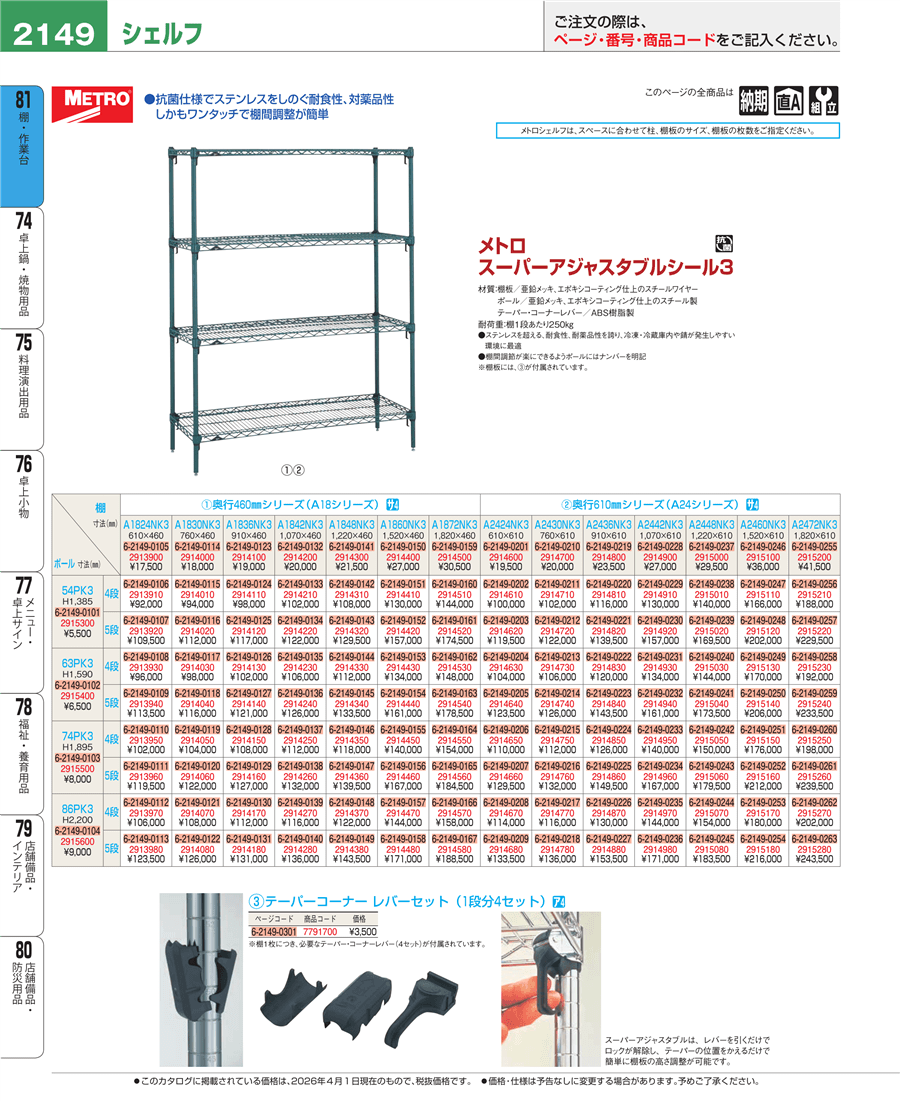 | e26-7791700 | メトロ スーパーアジャスタブル テーパーコーナーレバーセット(1段分4セット) | 上代 3,500円(税抜) 見積