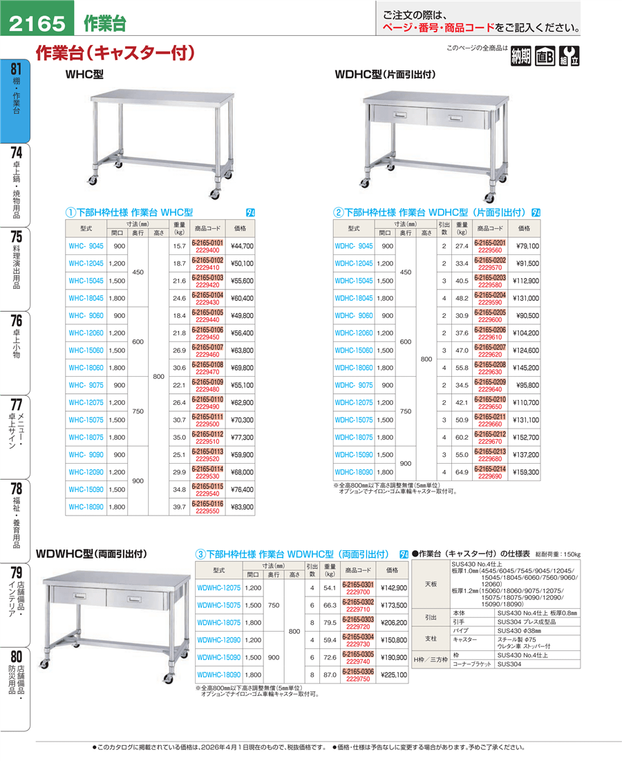 | e26-2229540 | 下部H枠仕様 作業台(引出無・キャスター付)WHC-15090 | 上代 76,400円(税抜) 見積