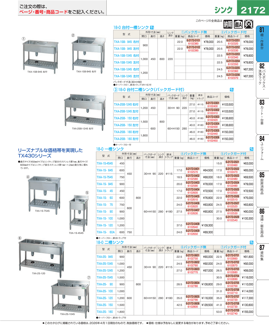 e26-610254018-0 一槽シンク(バックガード付)TXA-1S-100上代 100,300円(税抜)