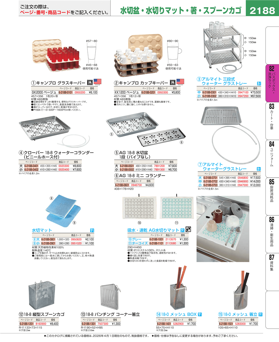 | e26-8160900 | 18-8 縦型 スプーンカゴ(Ⅰ型)133×73×H115 | 上代 8,400円(税抜) 見積 | ||