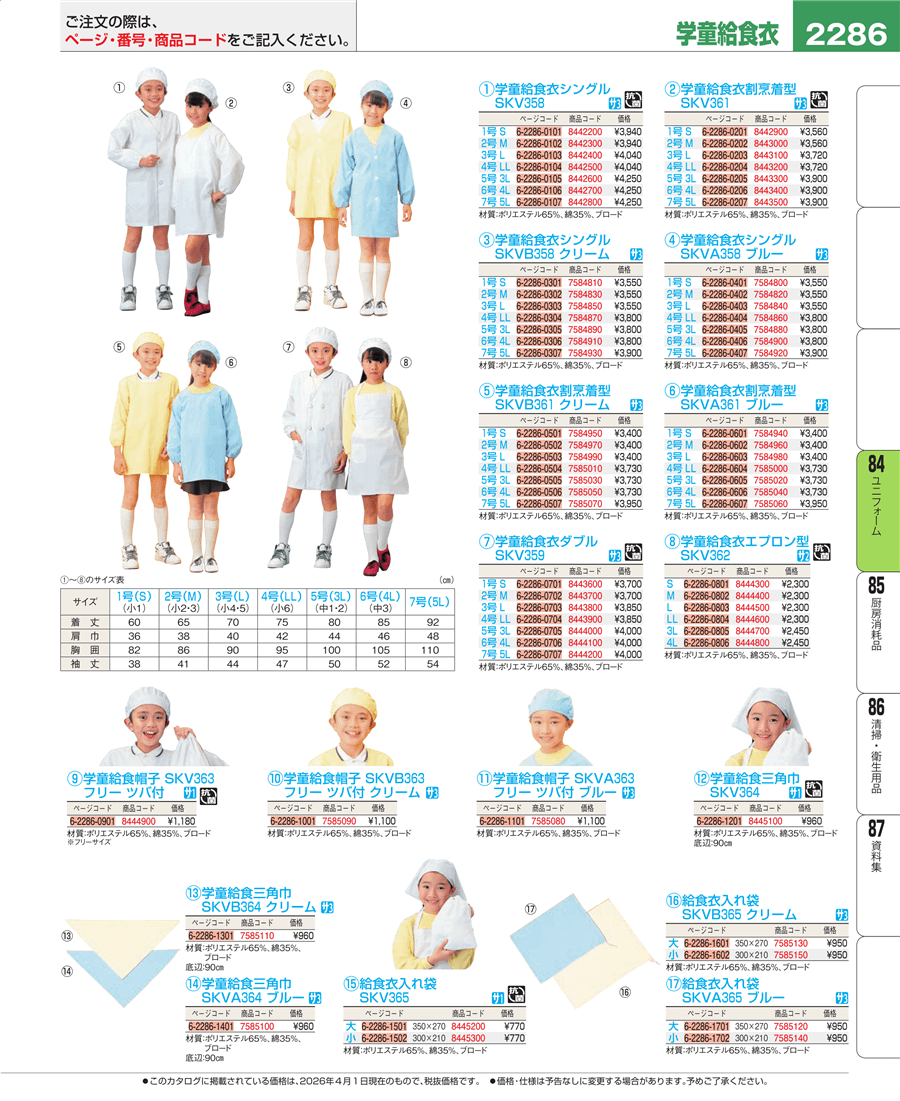| e26-8442200 | 学童給食衣シングル SKV358 1号 S | 上代 3,940円(税抜) 見積 | ||