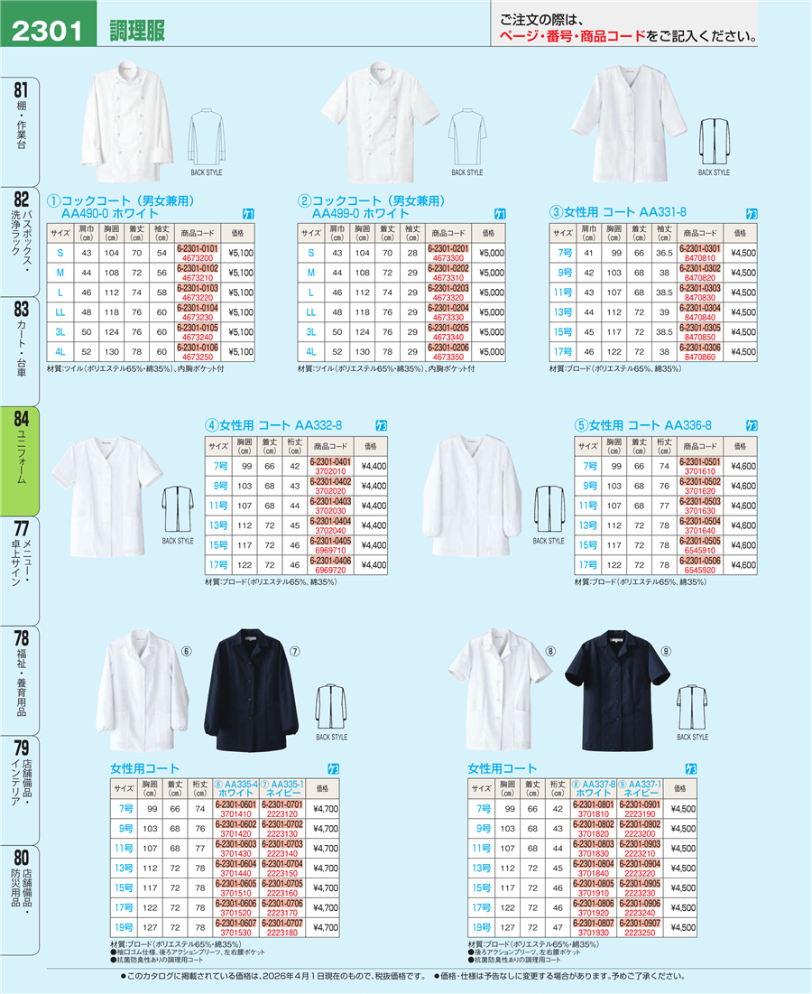 e26-3701620女性用コート(調理服)AA336-8 9号上代 4,600円(税抜)