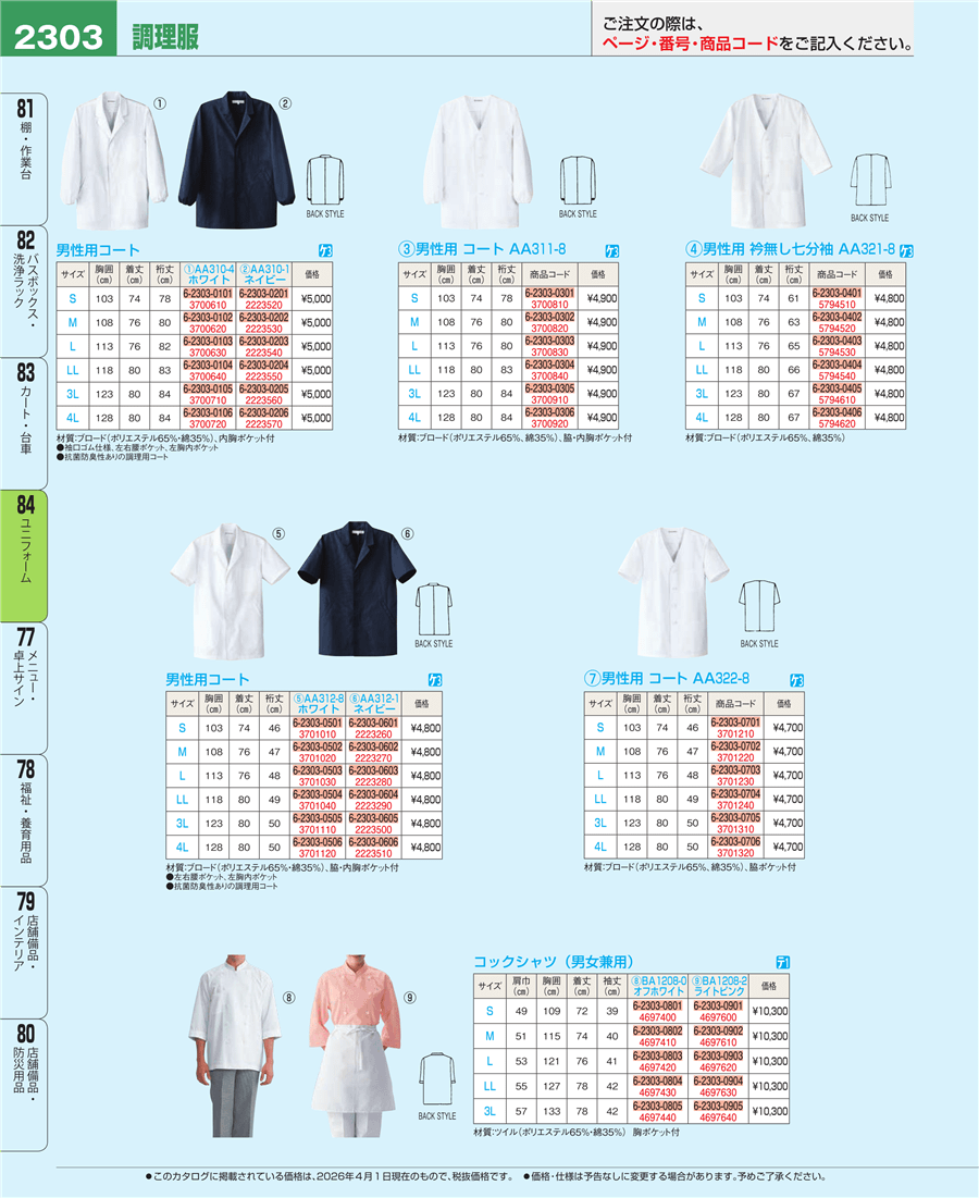 | e26-3701030 | 男性用 コート(調理服)AA312-8 L | 上代 4,800円(税抜) 見積 | ||