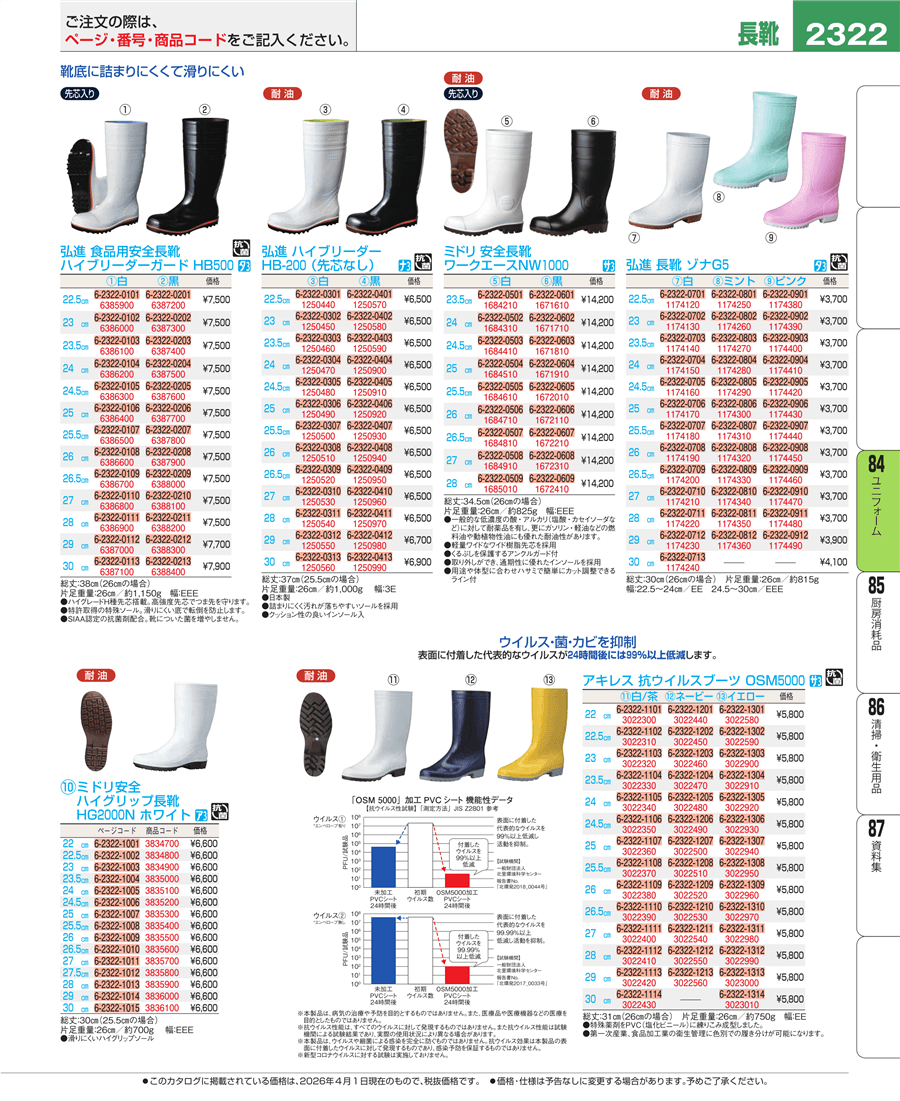 | e26-3022590 | アキレス 抗ウィルスブーツ OSM5000 イエロー 22.5㎝ | 上代 5,800円(税抜) 見積
