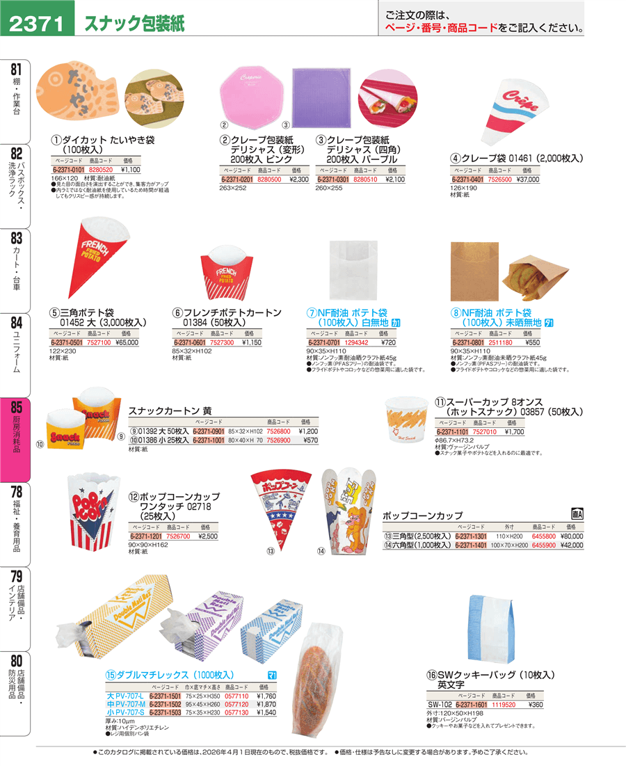 | e26-7526500-2371 | クレープ袋 01461(2000枚入)紙製 | 上代 37,000円(税抜) 見積 | ||