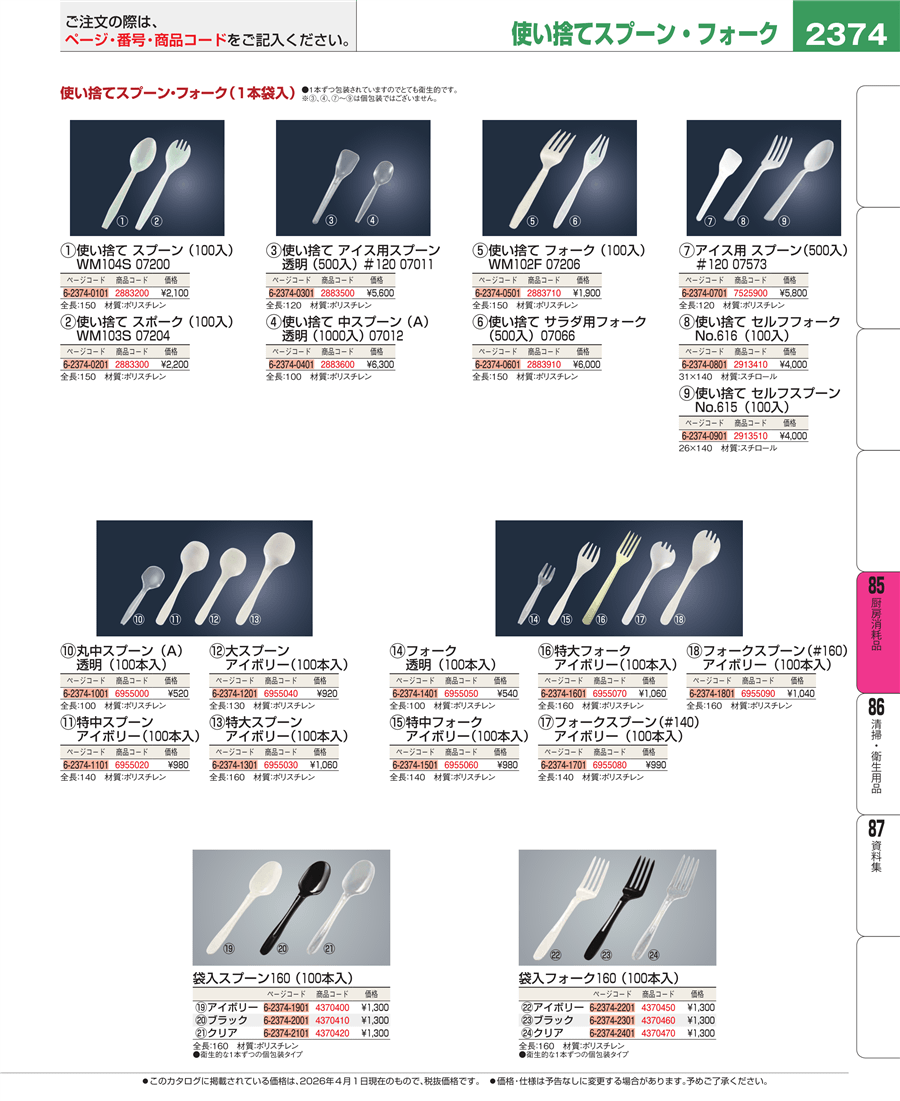 | e26-6955090 | フォークスプーン(#160)アイボリー(100本入) | 上代 1,040円(税抜) 見積 | ||