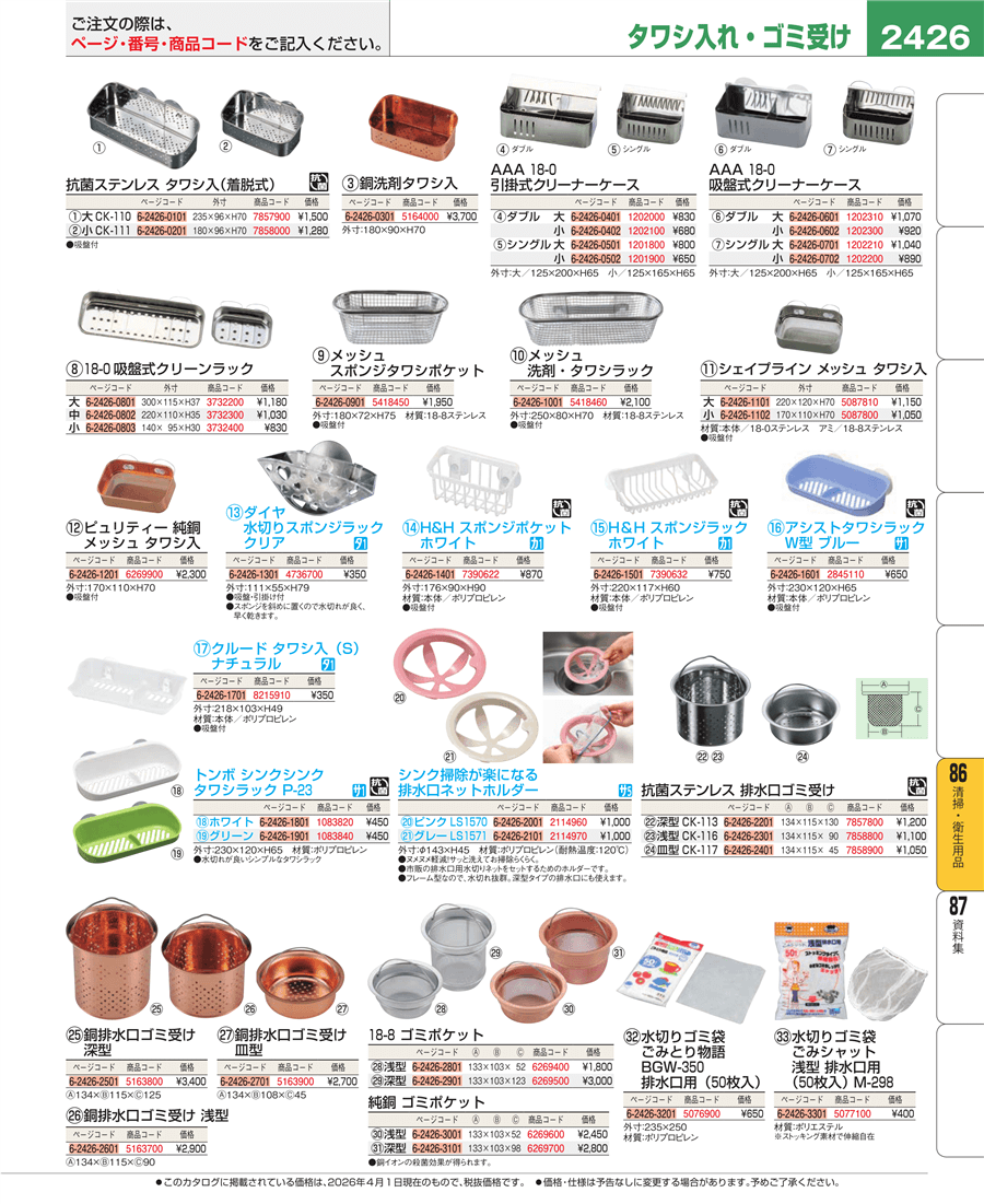 | e26-7858800 | 抗菌ステンレス 排水口ゴミ受け 浅型 CK-116(H90㎜) | 上代 1,100円(税抜) 見積 | ||