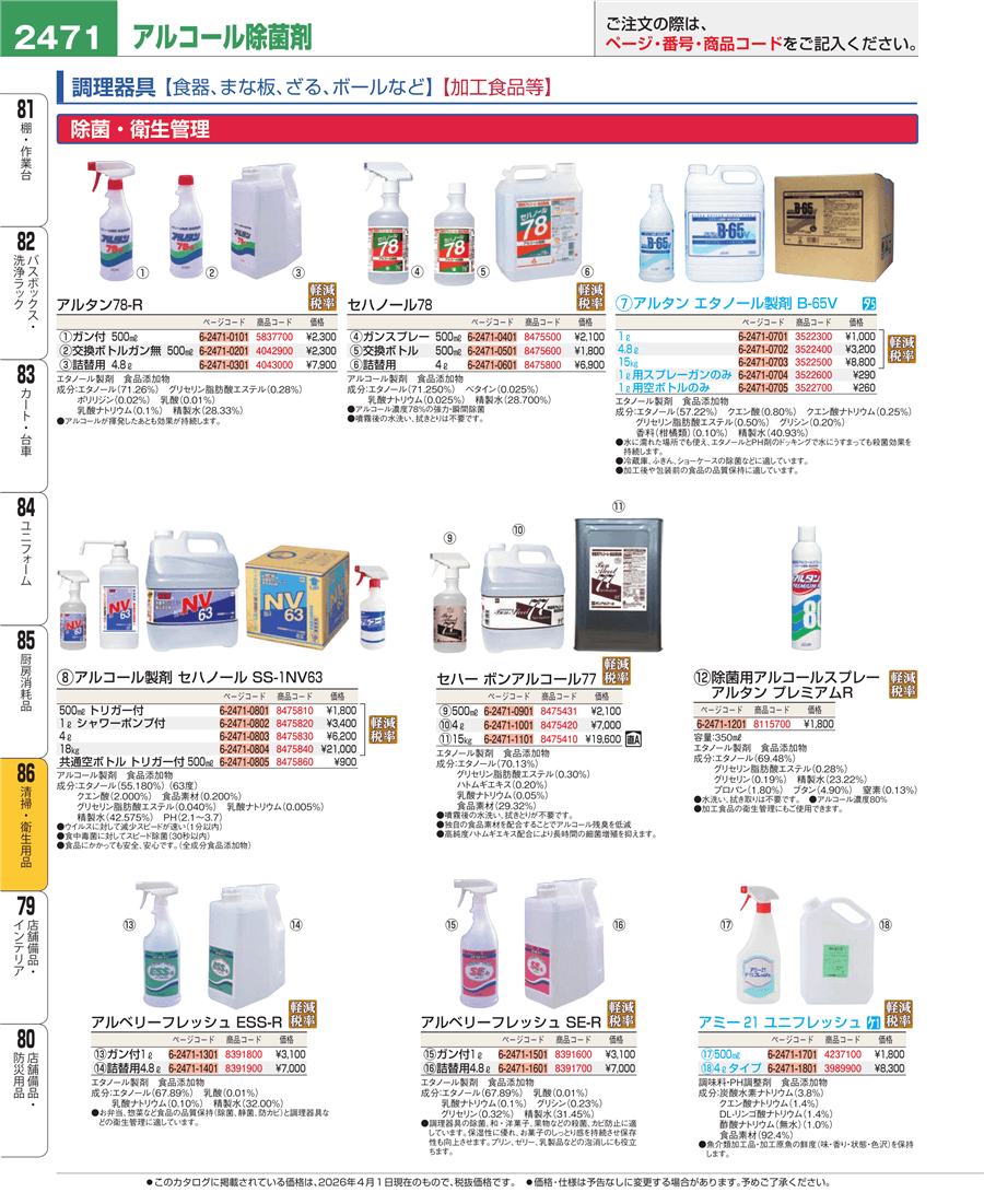 | e26-8475420 | セハー エタノール製剤 ボンアルコール77 4L | 上代 7,000円(税抜) 見積 | ||