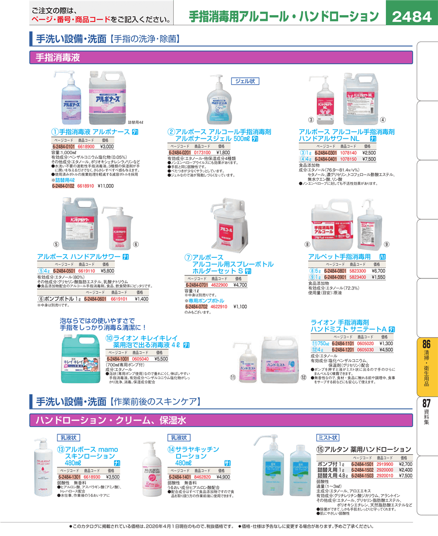 | e26-6619110-2484 | アルボース 手指消毒液 ハンドアルサワー 4L | 上代 5,800円(税抜) 見積 | ||