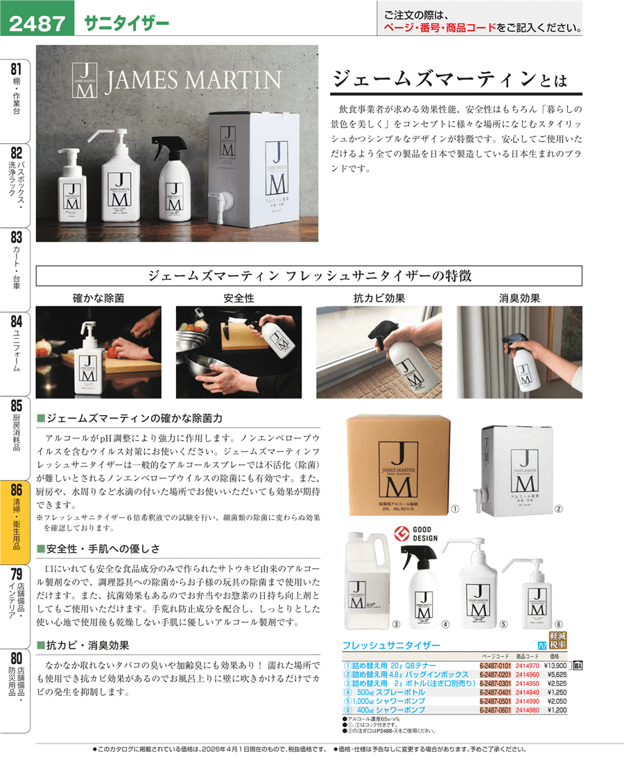 | e26-2414950 | ジェームズマーティン フレッシュサニタイザー詰替用2000ml(注ぎ口別売)30009 | 上代 2,525円(税抜) 見積 | ||