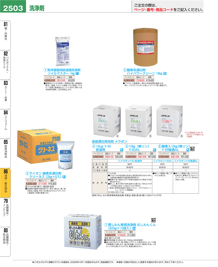 | e26-8364100 | 食器漂白用洗剤 メラポン 10㎏ Y-50 低温用(有リン) | 上代 25,000円(税抜) 見積 | ||