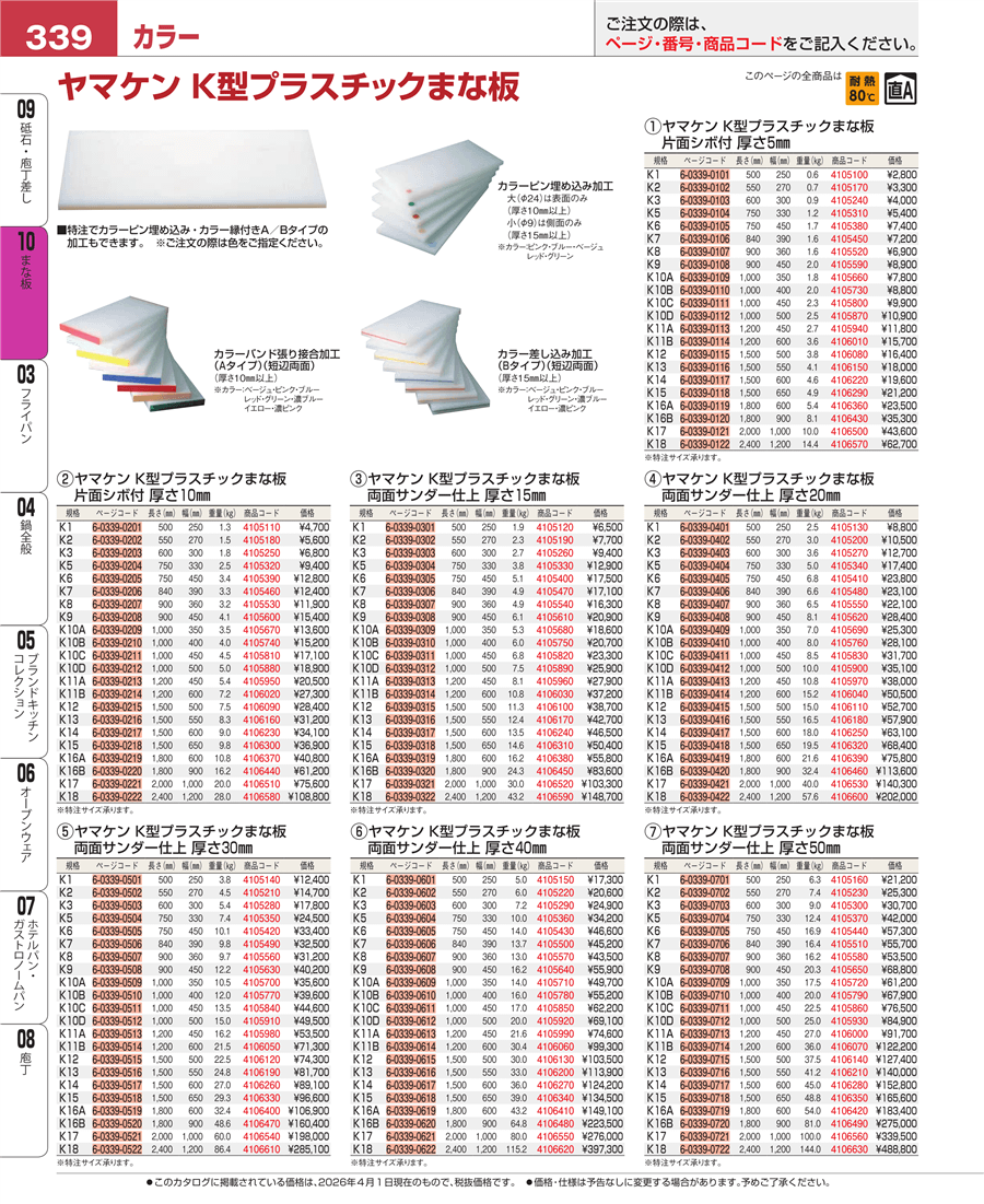 e26-4105400ヤマケン K型プラスチックまな板 K6 750×450×15 両面サンダー仕上上代 17,500円(税抜)