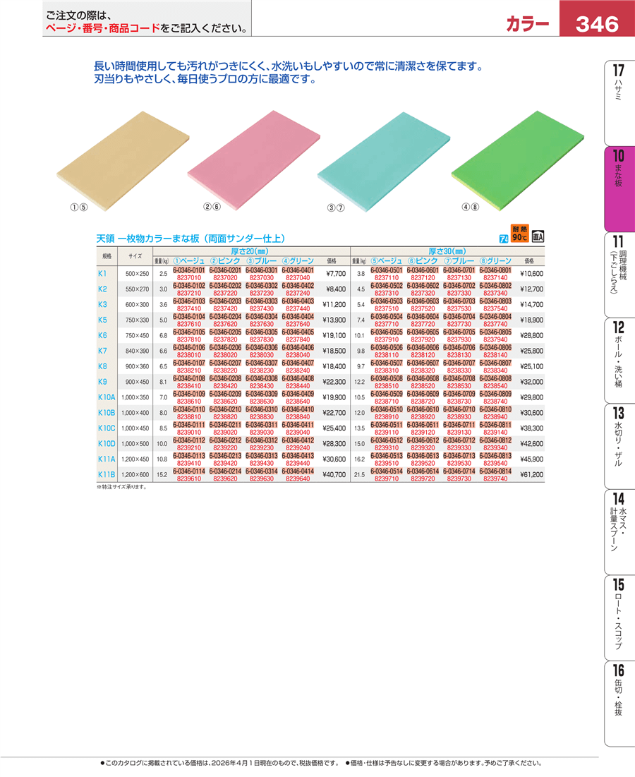 | e26-8238940 | 天領 一枚物カラーまな板 K10B 1000×400×30 グリーン | 上代 30,600円(税抜) 見積
