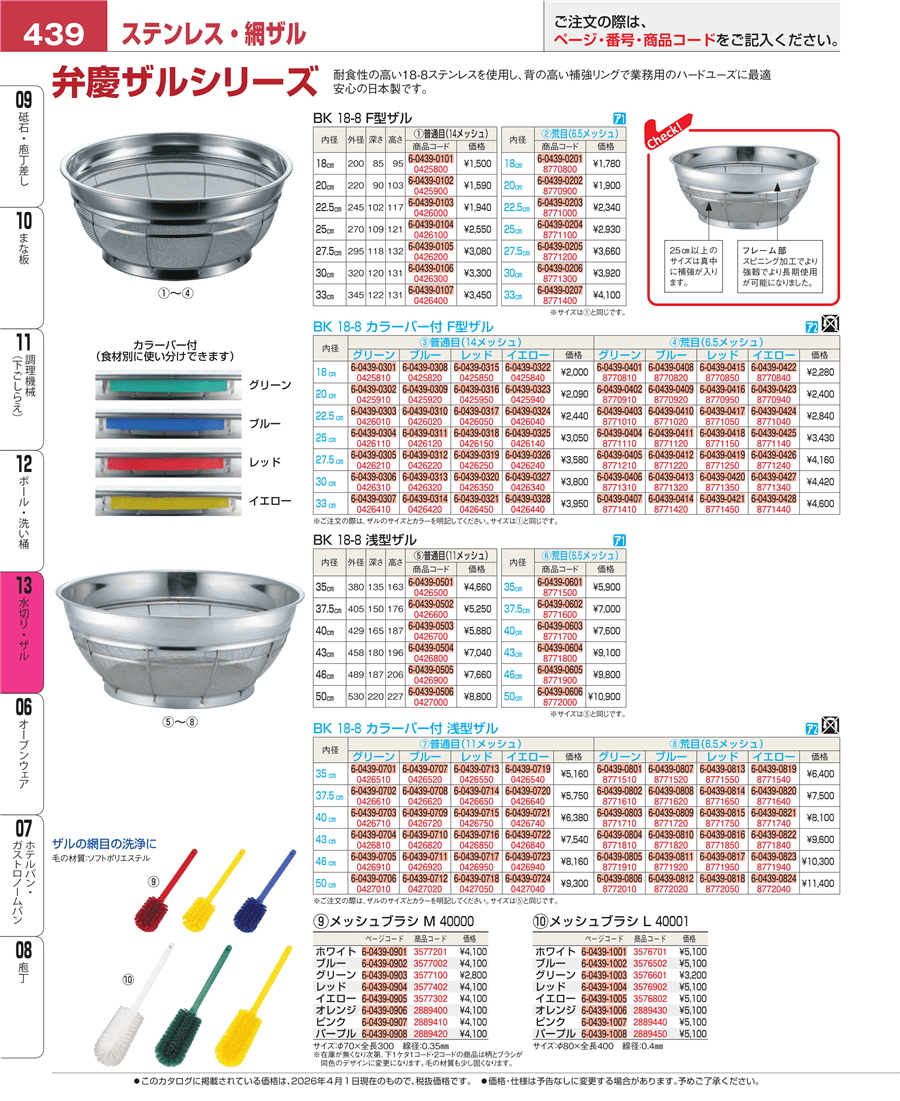 | e26-0426800 | BK 18-8 浅型ザル 普通目 43㎝ 11メッシュ | 上代 7,040円(税抜) 見積