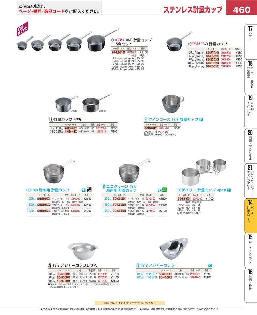 e26-4002600EBM 18-0 計量カップセット 5点セット上代 3,100円(税抜)