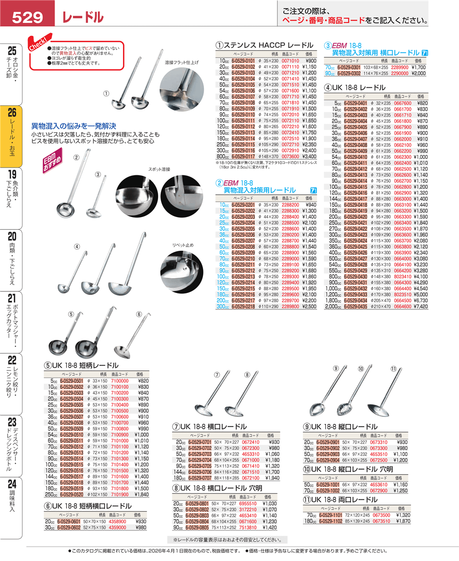 e26-2288400EBM 18-8 異物混入対策用レードル 20㏄上代 1,400円(税抜)